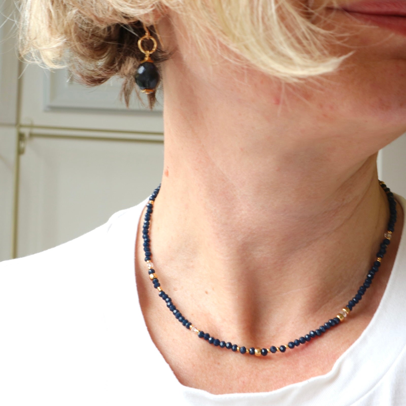 Lightweight elegant necklace handmade with navy Crystal , gold seed beads and clear crystal elements.