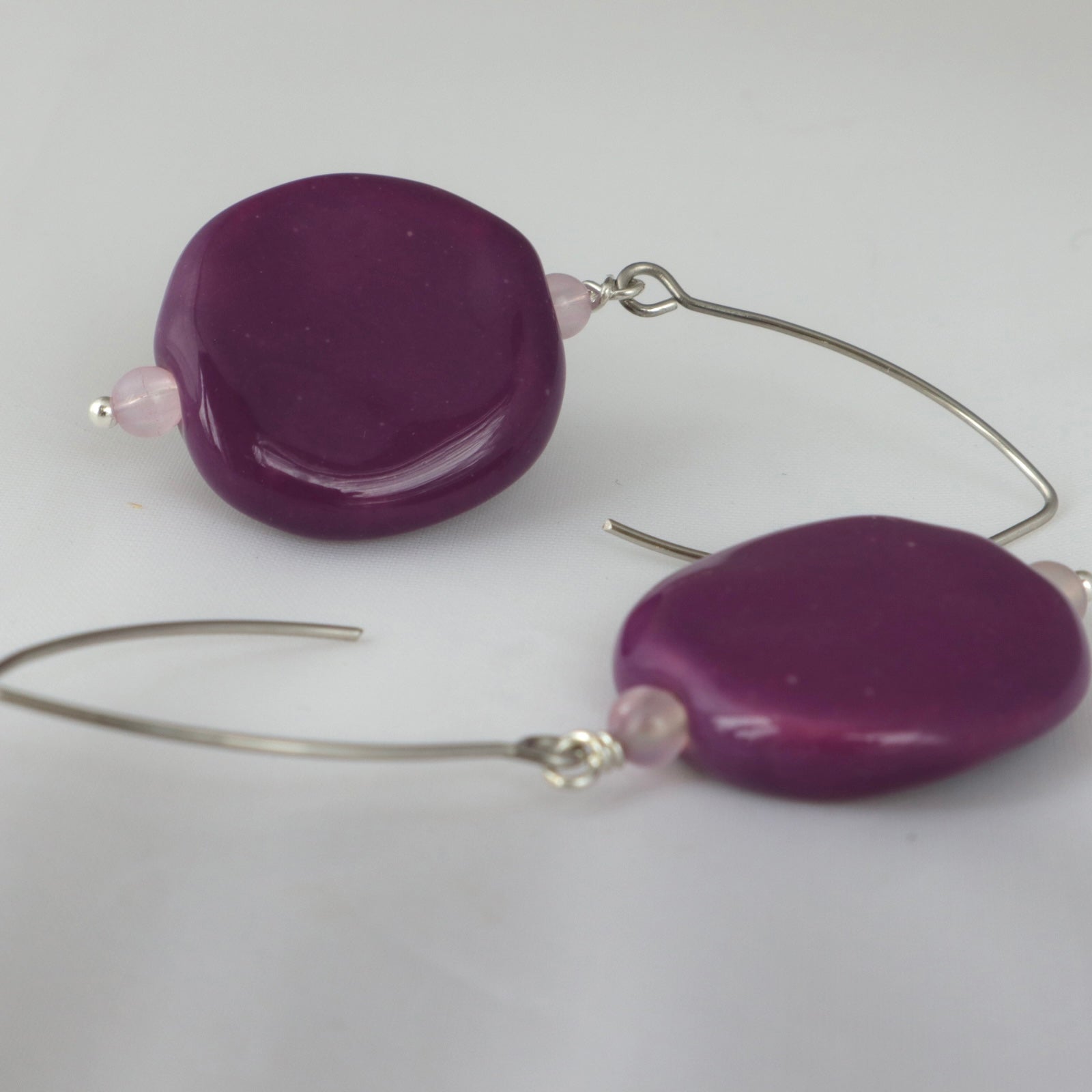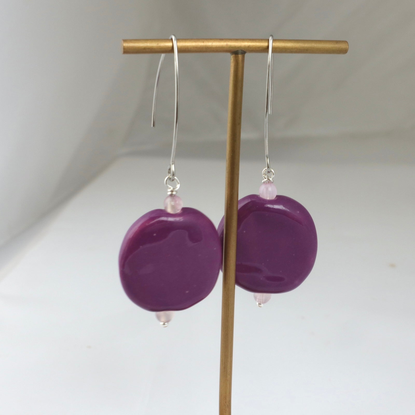 Ceramic slices of light purple . Boho style earrings that pop with colour .