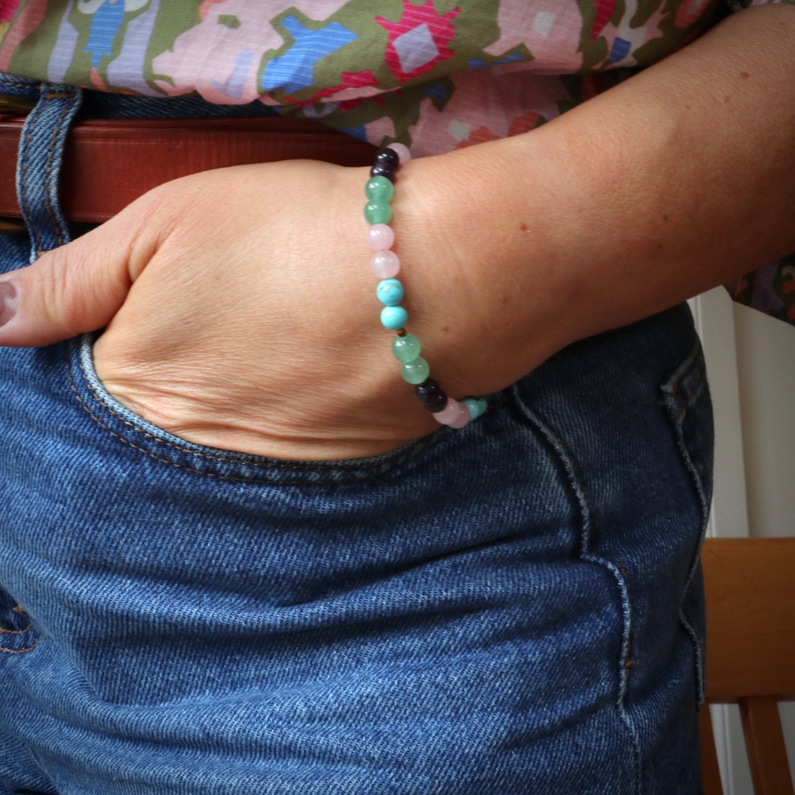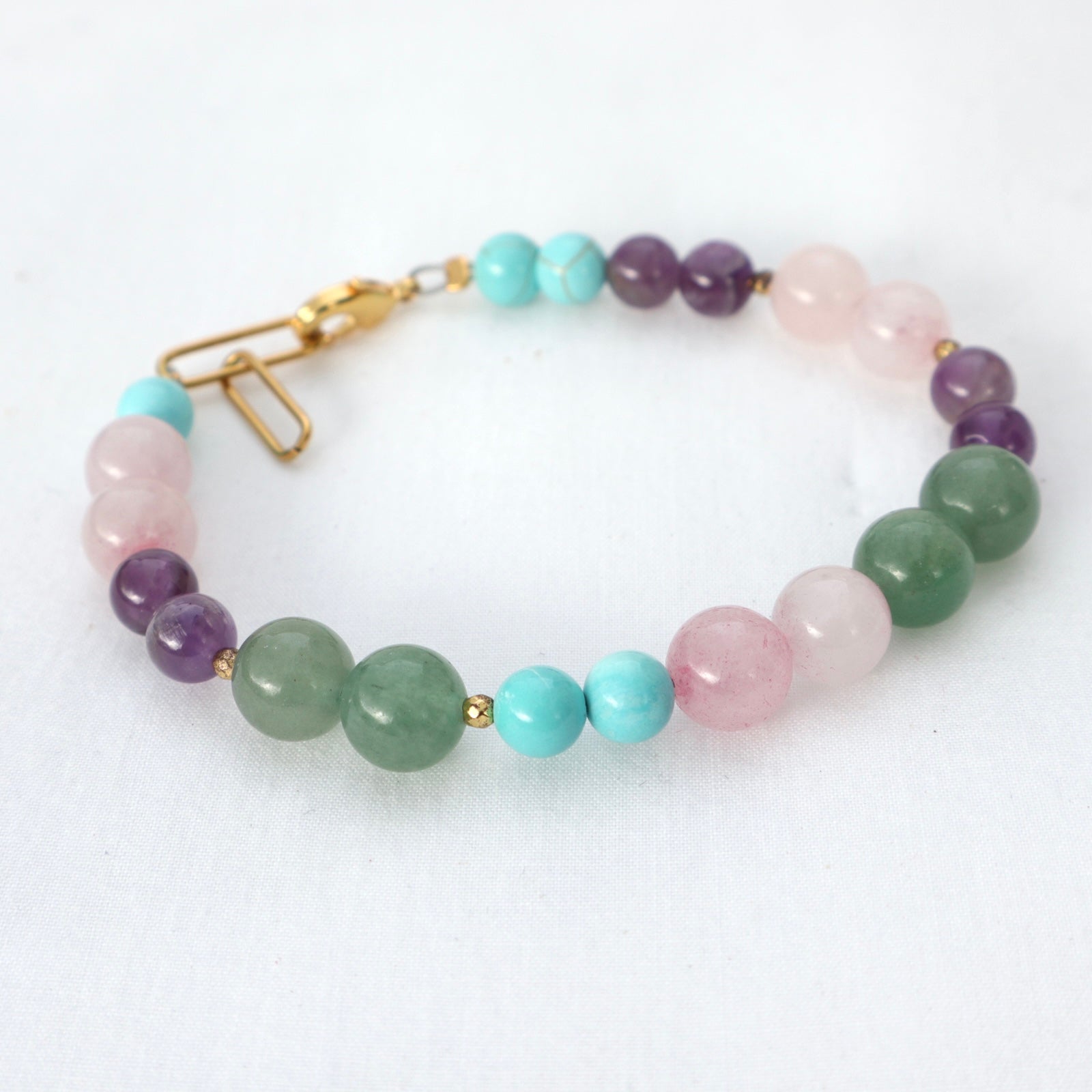 This bracelet features 6mm gemstone beads of pink rose quartz, amethyst, and green agate, making it perfect for layering or wearing as a standalone piece.