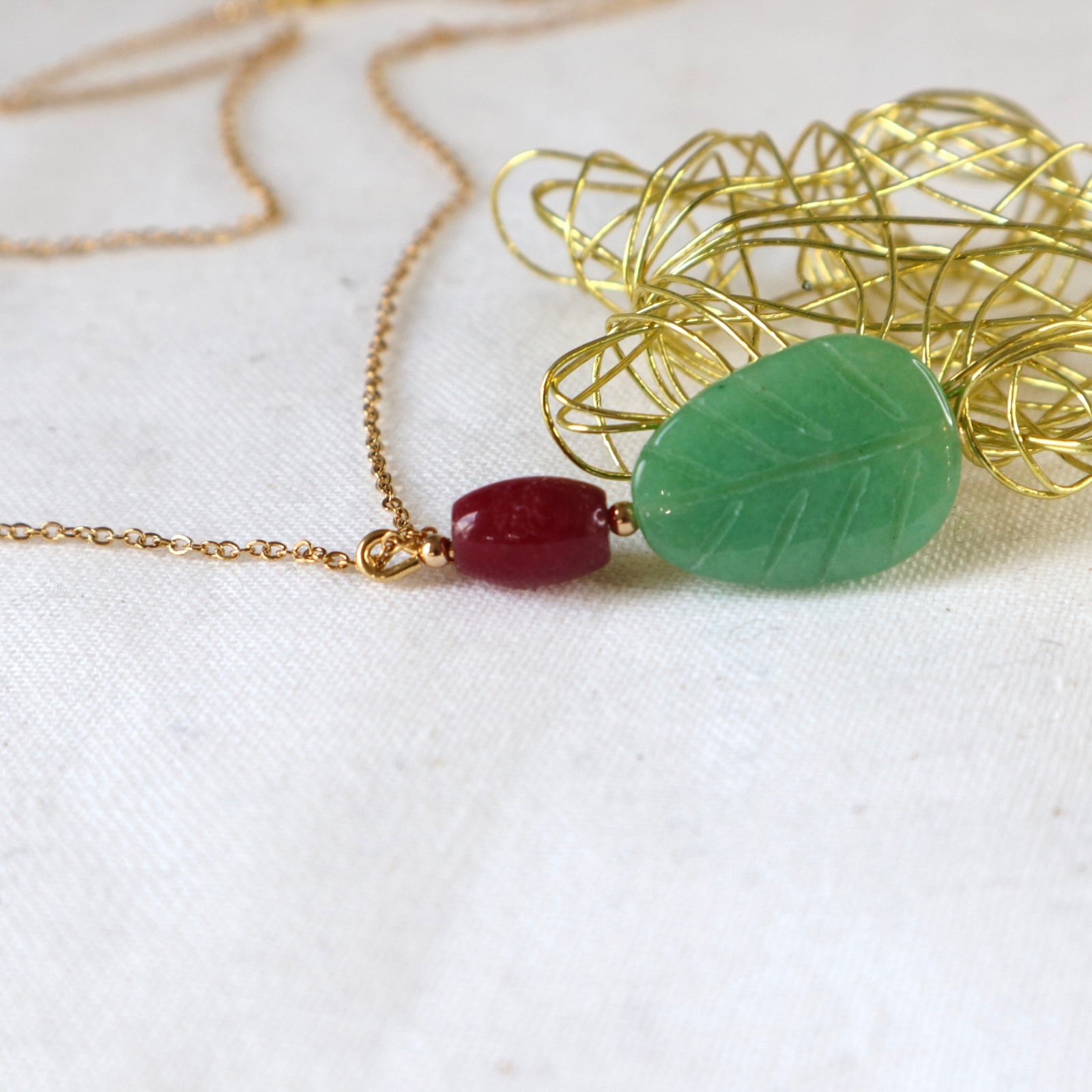 Handcarved from green aventurine this leaf shaped pendant is complimented with a gemstone deep burgundy gemstone .