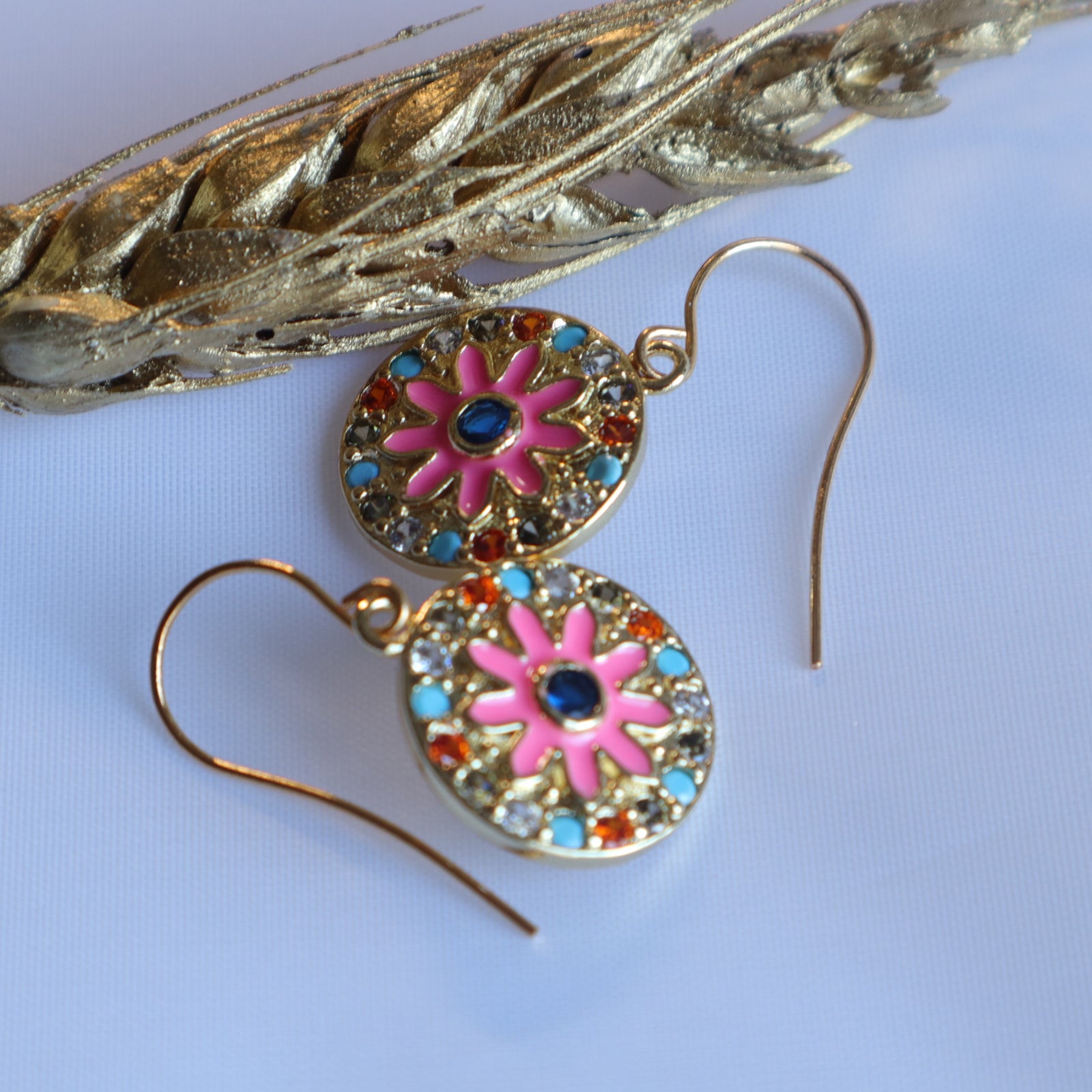 These Enamel and crystal earrings feature a lightweight, round, metal design with a pink flower and crystal detail .